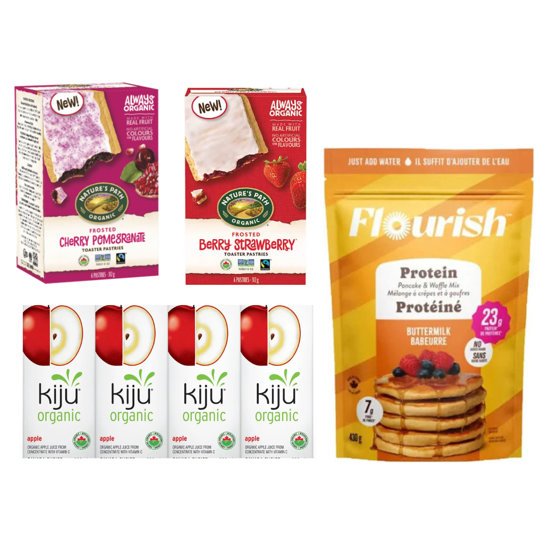 A hand-curated breakfast box filled with premium Canadian morning essentials, including Flourish Protein Pancake Mix — Buttermilk Protein (430g), Nature’s Path Organic Toaster Pastries — Cherry Pomegranate and Berry Strawberry (312g each), and Kiju Organic Apple Juice (4x200mL).